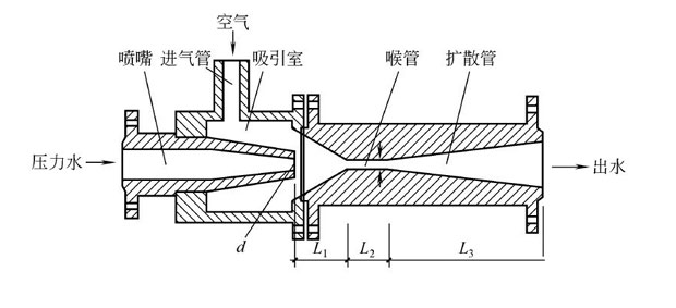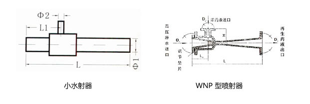 高壓原水通過(guò)管道閥門進(jìn)入噴射器的漸縮段,將靜壓頭轉(zhuǎn)換成動(dòng)能,在噴嘴處成為高速射流,使混合室形成微真空狀態(tài),將高濃度的再生藥液吸入混合室,并使再生藥液的壓力和速度發(fā)生變化;在混合段內(nèi),水和藥液得到充分地混合,然后注經(jīng)擴(kuò)散段,使再生液減低流速,靜壓頭升高,再通過(guò)出口管道及閥門將稀再生液送到交換器本體中。